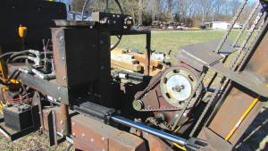 The machine is powered by a hand-cranked, 1945 LUC engine off a Deere combine. Located behind the driver’s seat, it powers hydraulic pumps that drive a pair of hydraulic motors. One motor is connected to a 3-speed manual transmission off a 1960 Ford pickup and provides gear reduction for the front drive wheels. The other motor, off a David Bradley walk-behind tractor and still attached to the tractor’s gearbox, is located behind the forklift mast. Rahn removed the tractor’s wheels from the gearbox and installed a pair of sprockets in their place, which are used to chain-drive the forks up or down.