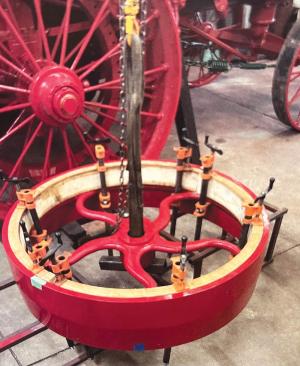 Calvin Gingrich, an Ind. wheelwright, did the steam bending on two pieces of white ash. Those fit on the inside of the wheel rim, where the wood engages the clutch. Wiley secured the half circles with lag bolts, then tapered the rim 8 degrees so the clutch shoes slide over the rim and lock in place.