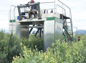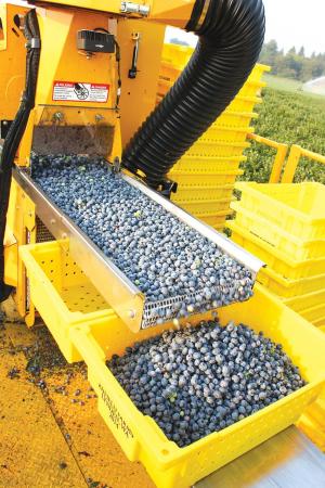 The Harvy 500, manufactured by FineField of the Netherlands, utilizes bendable brushes and workers who shake the blueberry bushes to drop the ripe fruit into a conveyor system that includes air to blow out debris before the berries fall gently into lugs and crates. Plans were to test them in British Columbia this year. www.finefield.nl