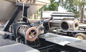 The fully sealed slew drive worm gear system raises and rotates the auger into position across a 270-degree range. Young explains that the slew drive allows the auger to move from one side to the other. When unloading is complete, the 22-ft. auger breaks with the upper end, rotating into cradles on either side.