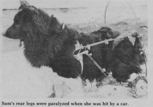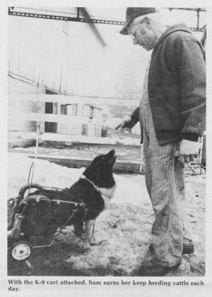 The six-year-old border collie was paralyzed several years ago when instinct overwhelmed common sense and she crossed the township road inpursuit of a rabbit. The hare escaped, but Sam was struck by a car.