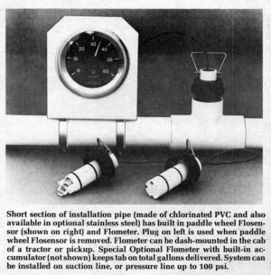 Heart of the system is a section of installation pipe which has a built in paddle wheel Flosensor device. A Flometer connects to the Flosensor via a long cord, allowing the meter to be remotely located on the dashboard of a tractor or pickup, or wherever most convenient. The Flometer gives the operator a direct reading or gallons per minute (GPM). To get gallons being applied per acre (GPA), you simply read the "GPM" reading on the dial and plug the figure into the following formula: