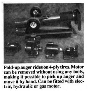 Raymond Johnson, president of Butte Manufacturing, says he originally built the auger to unload semi-loads of fertilizer. "Moving a big auger to fit under the trailer was an arduous task. In building a prototype, I wanted it to be compact to make it easy to move around but with high enough capacity to allow fast unloading. Key feature is that you can take the motor off the auger without using any tools, making it possible to pick up the auger and move it by hand. It also lets you interchange power units - from gas engine to electric motor to hydraulic motor, all without using any tools."