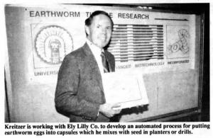 Kreitzer and Eli Lilly Co. are working together to develop an automated process for encapsulating earthworm eggs in gelatin capsules. The earthworm cocoon inside each capsule will hold up to 20 eggs depending on the earthworm species.