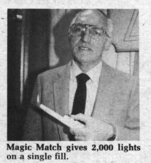 He says the Magic Match is safe, easy-to-use, and eliminates burned fingers from trying to light stoves with matches or cigarette lighters. Just a flick of the switch and an adjustable flame shoots out the end of the Magic Match. Flame length adjusts from ¢ to 3-in.