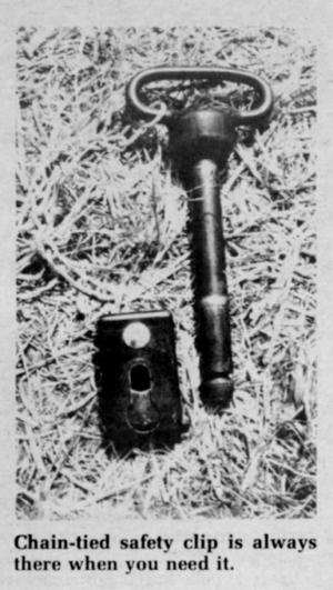 The hitch pin, manufactured by K & M Manufacturing, Renville, Minn., has a clip permanently fastened to it with a small chain. Just insert the pin and attach the automatically locking clip. Not even corn stalks will knock it off.