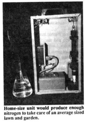 Richard Treharne of Melbourne Beach, Fla., and James Riley, Yellow Springs, Ohio, hope to put a small home-size unit on the market for about $200 that would produce enough nitrogen to take care of an average sized lawn and garden. It uses less than 200 watts of power.