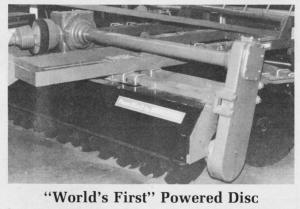 World's First Powered Disc DISKS Disks (58D) 7-3-26 "Our Power Disc doesn't work the soil up so much that it becomes compacted and yet it works twice as well as a conventional, unpowered disc," explains Alan Burchell, representative of Stockton Engineering, Birmingham, England, manufacturer of what may be the first ever conventionally designed trailing offset disc with powered gangs.