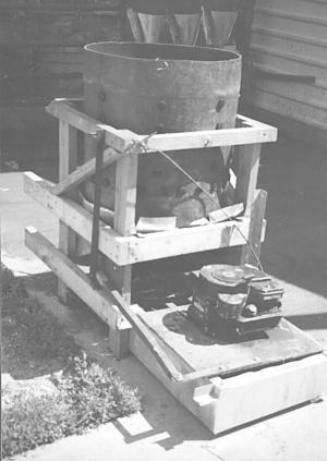 Kauffman's plucker is powered with an old Briggs and Stratton 3 hp mower engine.