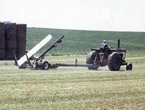 Weight of the machine is 5,300 lbs. At least a 65 hp tractor is needed to pull the hauler, which can be used at speeds of up to 6 mph depending on type of bales being moved, Nitzsche says. An electric solenoid control valve mounts on the side of the bale hauler. Only one hydraulic hookup is needed on the tractor.