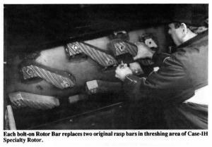 "Combined with the Specialty Rotor, they give you the best of both worlds ù great material handling capacity and top-notch threshing efficiency in virtually all crops and conditions," explains Marvin Gorden, inventor-manufacturer of replacement Rotor Bars. They improve threshing action by wedging crop material between each Rotor Bar and concave to thoroughly thresh out each head of wheat or ear of corn."
