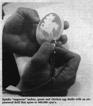 "You can put a picture of your own farm on the window using one of our special stencils made from a photo-graph and engraving kit. It's easy to do and an inexpensive way to personalize your vehicle," he says. When Spinks first got into glass egg engraving, he tried a regular dental drill but found that the slow speed of the bit and the angled head made it impractical. He worked with a manufacturer to design a straight-headed, air-powered drill that spins at an incredible 480,000 rpm's. Equipped with a carbide bit, the drill lets Spinks carve out egg shells or car and truck window glass almost as easily as drawing with a pencil.