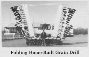 "We built our wing-type seeder from all new material except the boxes, which we modified from discer seed boxes. It takes about 6 min. to go from seeding to transport position and it'll travel at 20 mph. We rolled our own metal press wheels on a roller machine we made in our shop.
