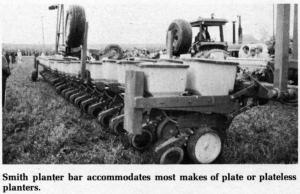 "We field tested it on 4,000 acres in '76. The bugs are out of it and it's ready to go," says L. Eugene Smith, of Smith Farms, Lebanon, Ind., inventor and manufacturer of this rear-folding toolbar planter which is available in a wide variety of units and row spacings up to 24 30-in. rows. Folds to 15.5 ft. transport width in five minutes. Toolbar for 24 rows (30 in. spacing) retails for $14,800, not including planter units. Accommodates Deere, IH Cyclo and other makes of planters.
