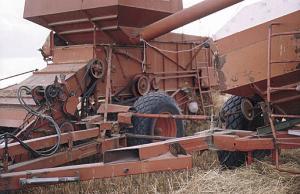 The add-on hopper gives Riopel more time between unloading. He says it has an-other unexpected benefit: "On soft ground, you can divide your load between the two hoppers so all weight is not on the combine. This way you can get through a lot more mud. It also makes the combine pull straight on muddy ground. You don't get the side draft you normally get with a pull-type combine."