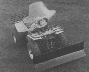 Universal ATV blade plows for moving snow or dirt are available through dealers from Bell Industries. The 48 in. tilt blade, made of 11 ga. steel, has a replaceable wear bar. Mounting bracket can be left on ATV when blade is removed. Blade lifts easily with hand-operated lever.