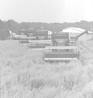 The Plotts used all four combines at the same time three years ago during a wet fall when fields were soft. "The big modern combines left wheel tracks 15 to 20 in. deep, but our old Massey-Harris models with 8-ft. headers left almost no wheel tracks. I also used them last year to harvest 40 acres of wheat."