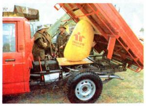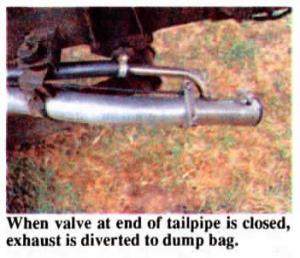 The dump bag mounts on a steel-reinforced plywood frame that's positioned on mounting brackets above the truck chassis. A second plywood frame fastens to the underside of the pickup box. The bag is inflated when a cable-controlled diverter valve, positioned near the end of the tail pipe, is closed, forcing exhuast air up into the bag. It requires just 8 lbs. of pressure to lift up to 2 tons.
