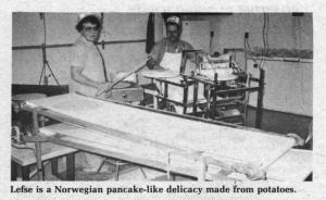 Thanks to the rolling machine which Evan developed, the factory, with only four employees, is able to turn out 1,500 rounds of lefse per eight hour shift. The factory operates seasonally, usually running from October to Christmas, and then again for about a month before Easter. The Lefse Shack has retail outlets in Glasgow, Scobey and Plentywood, and mail orders lefse all over the world. A 3-lb. package, containing 16 14-in. dia. rounds of lefse, retails for $12.50, including shipping.
