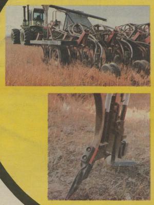 "Even with conventional double disk or hoe drills seed depth often varies 2 to 3 in. This drill won't vary at all once it's set since the planter unit floats up and down as much as 8 in. on the depth control bar. We've even planted grass and alfalfa seed accurately at 1/16th-in. depth," says Handy. "Also, we don't know of any other drill that'll deep band fertilizer in rows parallel with the seed and allow you to incorporate fertilizer all in one operation. What's more, you can tilt the angle of the sweep forward or back to adapt to hard or soft ground or the amount of stubble on the ground."