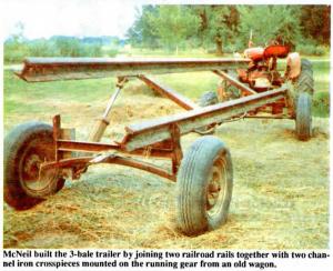 McNeil started with the running gear from an old hay wagon. He fitted it with a bale carrying frame made out of two 16-ft. railroad rails joined together by two channel iron crosspieces. To dump the bales, he salvaged a pair of 3 in. dia. by 18-in. long hydraulic cylinders taken from a worn-out elevator. The entire trailer, which is fitted with 15-in. wheels, weighs under 1,000 lbs.