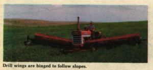 The interseeder takes a 25-ft. swath and plants soybeans in 15-in. rows. It's mounted on a 560 International tractor set for 75 in. wheel tread and equipped with 12.4 by 38-in. tires on the rear, and 7.50 by 16 mono-rib tires up front. Planter boxes, salvaged from a Deere model B drill, hold 25 bu. of beans (with side extensions). Drill wings on each side of the tractor are hinged to follow slopes and have a "crazy wheel" at the outer end (equipped with a 6.00 by 16 mono-rib tires) for support. The mono-rib tires help part the wheat, minimizing damage as they roll through the field. The drills fold back for transport and can easily be removed by unfastening just two bolts.