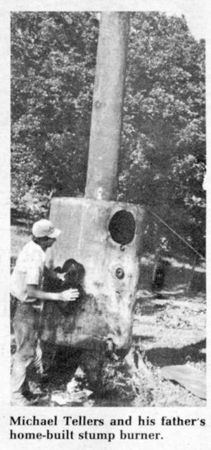 Tellers used a rusted 300-gal. storage tank as the main chamber of his home-built stump burner. He attached a chimney stack to one end, cut off the other and cut a stoker hole in the side. He sets the rough-looking stove over the top of a stump and throws in a few wads of paper to get the stump started burning, or smoldering. According to Tellers, he doesn't have to add fuel to the fire to keep it going. Although it burns slow, he says it eventually burns right down below ground level into the roots.