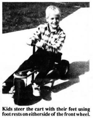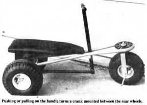 You steer the cart with your feet using foot rests on either side of the front wheel, and when you push or pull on the handle it turns a crank mounted between the rear wheels. The cart has a vinyl cushioned seat. Overall dimensions are 36 in. long, 18 in. wide and 18 in. high. Weighs 35 lbs.