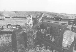 The tractor sat for so long a cottonwood tree grew up through it, even growing around the gear shift lever which extends right through the trunk. When the present owner of the farm decided to clear out the grove, he came across the firmly anchored tractor. Nearby farmer Ralph Oliver offered to buy the tractor. He cut the tree trunk off above and below the tractor and hauled it away with the chunk of trunk still in place. It wasn't long before Oliver started taking it to antique tractor shows to give showgoers something to admire and won-der about. During a show near Grant, Iowa, Oliver brought in a wood carver to carve a face onto the chunk of wood. Farmers passing by were heard to comment: "I remember getting sore arms turning that steering wheel" and "That spring seat sure was stiff", or "The one we had sure used a lot of fuel". Contact: FARM SHOW Followup, Ralph Oliver, 921 North St. Paul, Sioux Falls, S. Dak. 57103 (ph 605 338-4017).