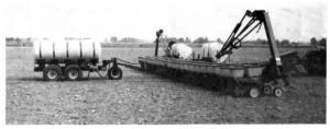 A pair of 500-gal. saddle tanks on the planter supply starter fertilizer to the openers through a ground-driven piston pump mounted on the planter. When the fertilizer supply runs low in the saddle tanks, Martin flips a toggle switch on the tractor to activate a pump on the caddy which sends fertilizer forward through a hose to refill the saddle tanks. Most 24-row planters aren't sold with fertilizer application tanks because the weight of the fertilizer would interfere with folding of the planter for transport. A local implement dealer mounted the two 500-gal. tanks on the planter for Martin. By using the two 500-gal. tanks on the planter and pulling our 1,600-gal. tank behind it, Martin can apply a lot of fertilizer without having to worry about folding the planter.