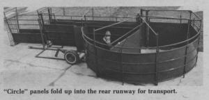 In the working position, the unit is 32 ft. long and has an 8 ft. working chute, a 16 ft. runway with 2 no-backs, and a 10 ft. circle equipped with an 8 ft. swing gate. You can direct animals into the circle from 2 directions ù the back and side. An added feature is that there's an entry door between the runway and working chute so you don't have to climb the panels to get in behind the animal.