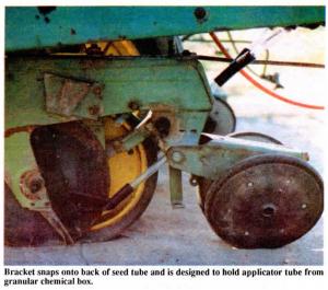 The bracket attaches to the back of the seed tube and is designed to hold the applicator tube from the granular chemical box. Eliminates the L-bracket (on Deere, Kinze, and New Idea planter units) which is positioned 10 to 12 in. behind the seed tube. "Under many conditions, that's too far back. The furrow is already closing by the time you drop the chemicals, so they're wasted," says John House, Oak Grove, Louisiana, inventor of the new "Tube Alignment Bracket". He came up with the idea last year and has already sold thousands of units. Many Deere dealers have started putting them on new planters, and Deere & Co. officials took a look at the new bracket but have not yet licensed it from him.