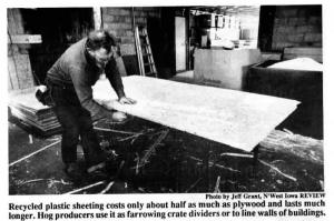 The company, located on Houtkooper's farm near Hull, Iowa, is the first recycling business of its kind in the Midwest and possibly the country. "We're taking a throw away product and making something good out of it," says Houtkooper, who markets the sheets through lumber yards, elevators, and hog equipment dealers. Re-cycled plastic sheeting costs only about half as much as plywood and lasts much longer because it doesn't rot and is so smooth that bacteria can't stick to the surface, says Houtkooper, adding that he hasn't found a hog yet that can wreck it. You can nail through the sheets or use sheetrock screws. No pre-drilling is required.