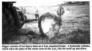 The digger consists of two heavy tines mounted on a square frame. A hydraulic cylinder takes the place of the center stationary arm on the 3-pt. The cylinder tilts the teeth downward so when you back towards the rock, with the 3-pt. in the down position, the digger pushes into the ground next to the rock. Once you're up against the rock, you use the cylinder to rotate the teeth upward to loosen the rock. At the same time you drop the 3-pt. some more, or you may have to drive ahead a little and back up again, allowing the digger to work further under the rock. Then you can lift the rock out of the hole and haul it off the field on top of the tines. The tines can also be used to drag dirt into the hole to fill it.