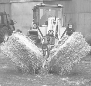 Three bale forks on bottom of the 460-lb. attachment allow bales to be hauled from the stacking to the feeding area, then sliced up in a few seconds into as many sections as desired.