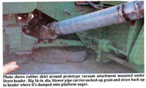 You've never seen anything like this new add-on vacuum pickup for combines that mounts behind the header, sucking up shattered kernals on the ground and delivering them back up to the platform to be fed into the combine.