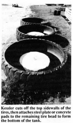 The Kesslers buy discarded earth-moving equipment tires from mining companies in the eastern U.S. The tires are hauled by semitrailer once a month to their ranch. Kessler uses a machine he invented to cut off the top sidewalls of the tires. He attaches steel plate or concrete pads to the remaining tire bead to form the bottom of the tank. Then he installs drain and overflow pipes.