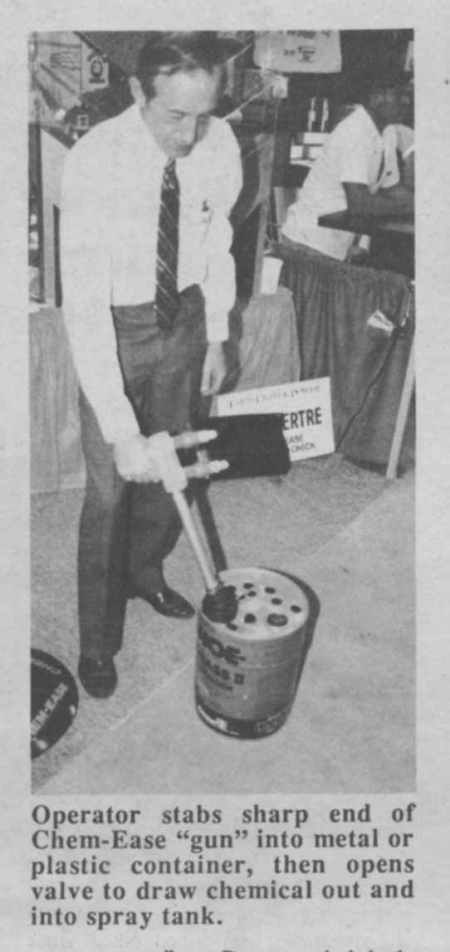 What's more, after emptying containers and feeding chemicals to the spray tank, Chem-Ease automatically rinses out the can with water and feeds that to the spray tank, too. The unit works so well that some sprayer manufacturers have started to supply it as standard equipment on every sprayer they sell.