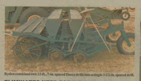 He and his son, Dave Ryden, Jr., built the double drill by combining two 12-ft., 7-in. spaced LL Deere drills to make a 3 1/2-in. spaced drill. The press wheels from the front drill are all mounted on the back drill so each disc opener is followed by a press wheel. Specially built harrow teeth behind each disc opener throws moist soil back over the seed, mixing enough dry soil with the moist so the press wheels will not build up with mud. (These harrow teeth work so well Ryden now manufactures them to fit other drills.) He says that by harrowing as he seeds he can eliminate another trip over the field and get more moisture to the seed for faster germination. "We have not converted any other drills to double-seeding so we don't know how difficult it would be with other models. However, if there is enough interest, we hope to begin manufacturing double drills using existing, used equipment," says Ryden.