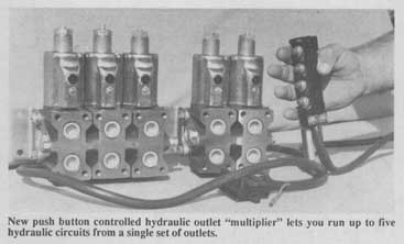 New push button controlled hydraulic outlet "multiplier" lets you run up to five hydraulic circuits from a single set of outlets using a push-button control that slips over your tractor's existing hydraulic lever.