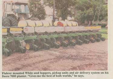 So he removed the seed hoppers and seed pickup units from the planter and replaced them with seed hoppers designed for a White air planter along with a White air delivery system including fan, hydraulic motor, tubes, and hoses. He bought the equipment new from a White dealer.