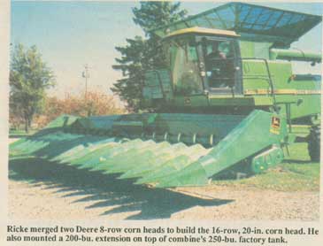 "I don't think any one's ever built a corn lead with more rows. Really speeds up harvest," says John Ricke, Williams, Iowa, who merged two Deere 8-row corn heads to build a 16-row, 20-in. corn head that he mounted on his Deere 8820 combine.