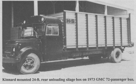 Rod Kinnard has been turning school buses into self-unloading wagons for over 25 years. His latest self-propelled wagon was built from a 1973 GMC 72-passenger bus equipped with a 5-speed transmission. He mounted a 24-ft. rear unloading H & S silage box on it.