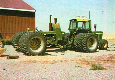 When Rudy DeBruycker, Dutton, Mont., decided he needed a more powerful tractor, he bought two used 140 hp Deere 5020's and coupled them into a single 280 hp unit. Both tractors are equipped with triple rear wheels, giving him 12-wheel drive.