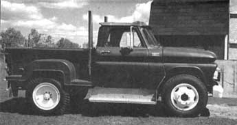 The 2-way hood can be opened front to back like a conventional pickup or flipped up from in front of the windshield. The double-hung hood was necessary to provide easy access to the big engine without changing the looks of the pickup body. The hood and fenders flip forward on a hinge made of pipe fitted about 2 in. above the frame rails.