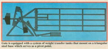 The gate is equipped with a system of weight transfer tanks that mount on a triangular steel base which serves as a pivot point. A system of enclosed rotating shafts extend out to either side of the gate to steel "lift pads". Once you drive a vehicle onto a lift pad, it takes about 5 seconds for the gate to lift up. Fluid flows from a storage tank to a holding tank that holds the gate in the open position. Once you pass through, fluid flows to an auxiliary tank which allows the gate to slowly drop back down. Fluid from the auxiliary tank then flows back into the storage tank, the weight of which drops the gate back into a catch bracket.