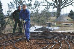 Another design wraps the water lines around upright fencing and piles the wood inside and outside to bury the water lines. Finally, an even simpler version uses chipped wood in sacks. Eight men can fill and stack 1,000 sacks for a 1,300 cu. ft. compost heater in about 6 hrs., Cuhls says.