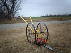 The Chainsaw Caddie can be ordered with either rubber or steel wheels, both 26 in. in dia. “The steel wheels push just as easy as the rubber wheels and won’t go flat,” notes Johnston.