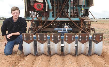 Wesley's device uses specially designed tillage points combined with trailing metal wheels shaped in a "V". The wheels press the soil into a triangular raised bed row. Between the raised soil is a shallow furrow that collects water as it runs off the raised beds. The steep incline encourages water runoff into a center channel, where it seeps into the soil, around the roots of the planted crop. Wesley said the machine was tested at 2 Australian locations in 2012 and 2013 and it showed that 26 percent yield gains were made with 18-in. row spacing. Trials of the Wesley Wheel are continuing in Australia this year.