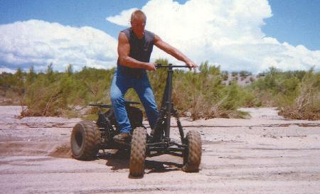 The frame was made with 1-in. square tubing, and the front axle is 2-in. pipe. With four, 20-in. high wheels, the stand-up rig is just under 40 in. wide and 6 ft., 3 in. long. Except for brake pedals on the floor, all controls are all mounted on the T-bar handlebars. It stands about 54 in. high.